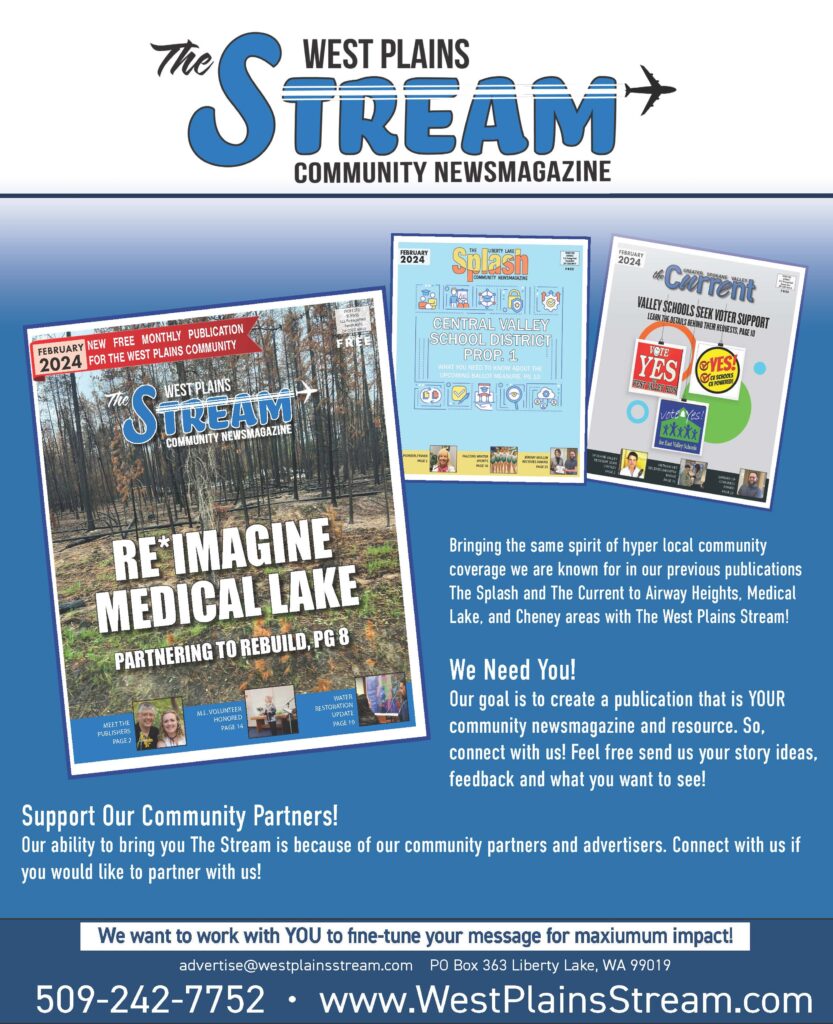 About 11,000 copies of The Stream are distributed mid month to more than 9,700 homes and a number of high-traffic locations in Airway Heights, Medical Lake, and the Fairchild Airforce Base.